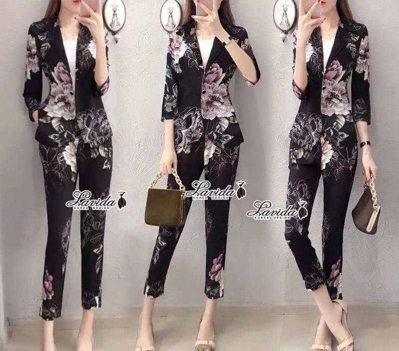 งานเซตเสื้อ+กางเกง ดีไซน์สไตล์เกาหลี เสื้อทรงคอสูท แต่งกระดุมหน้าเม็ดใหญ่ ใส่แบบติดหรือปล่อยได้ค่ะ พิมพ์ลายดอกไม้โทนชมพูบนผ้าพื้นสีดำ งานบุซับในอย่างดี มาพร้อมกางเกงลายเด่วกันแต่งกระเป๋า2ข้าง ซิปหลัง งานผ้านิ่มลื่นเบาๆ ใส่เข้าเซตก็เก๋หรือmatch ได้หลายสไตล์เลยค่ะ