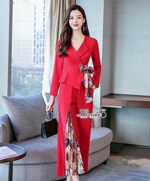 เซตเสื้อ+กางเกง ดีไซน์เสื้อทรงคอVป้ายพับข้างนึง เก๋ที่เอวเสื้อมีอะไหล่ทองวงกลมให้ผูกโบว์ผ้าลายโทนแดงให้เข้ากับขากางเกงอัดพลีทข้างเดียว มีซับในอย่างดีเก๋มากๆค่ะ กางเกงทรงขากว้างสม๊อคเฉพาะด้านหลังมีซิปข้าง ผ้าpolyesterเนื้อดีสวยไม่ร้อน จัดด่วนๆนะค่ะ